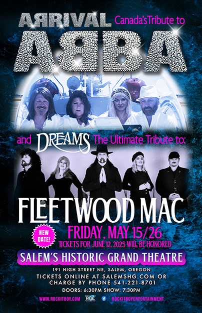 Rock.It Boy Entertainment of America presents ARRIVAL: CANADA’S ULTIMATE TRIBUTE TO ABBA WITH DREAMS: THE ULTIMATE FLEETWOOD MAC TRIBUTE Friday May 15, 2026 at Salem’s Historic Grand Theatre, 191 High Street NE, Salem, OR. Tickets are $49.50 (Plus Facility Fee & Service Charges) available at the Box Office or online at etix.com/ticket. Doors 6:30PM. Show 7:30PM.